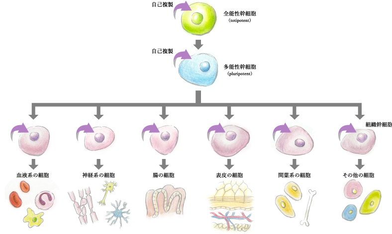 組織幹細胞は何にでもなれるのではなく、血をつくる造血幹細胞であれば血液系の細胞、神経系をつくる神経幹細胞であれば神経系の細胞のみ、というように、役目が決まっています。