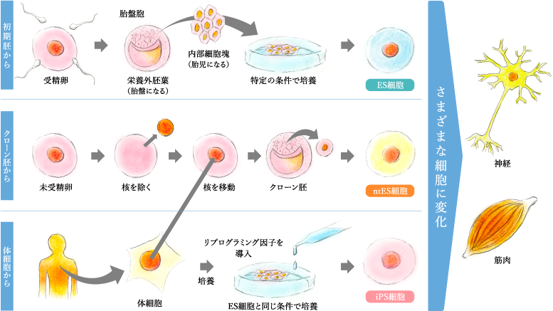 受精前の卵子から核を取り出し、皮膚など他の体細胞の核を移植して胚(クローン胚)を作り、胚の内側の細胞を取り出して培養したものをntES細胞といいます。