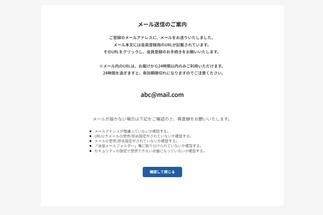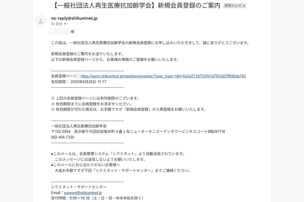 メール本文に記載されている会員登録用のURLをクリックし会員登録手続きをお願いします。