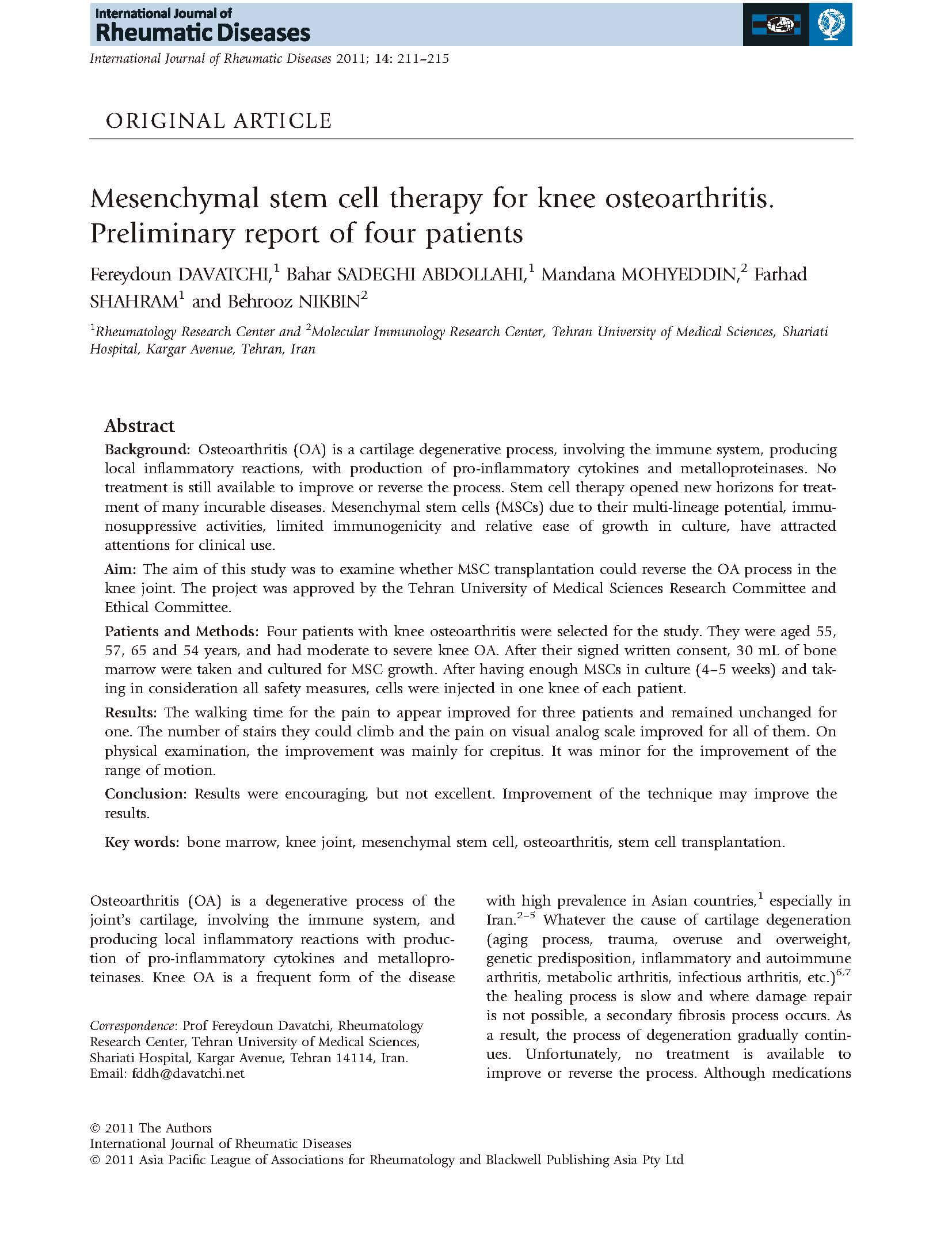 変形性膝関節症に対する間葉系幹細胞療法(4人の患者の報告)
