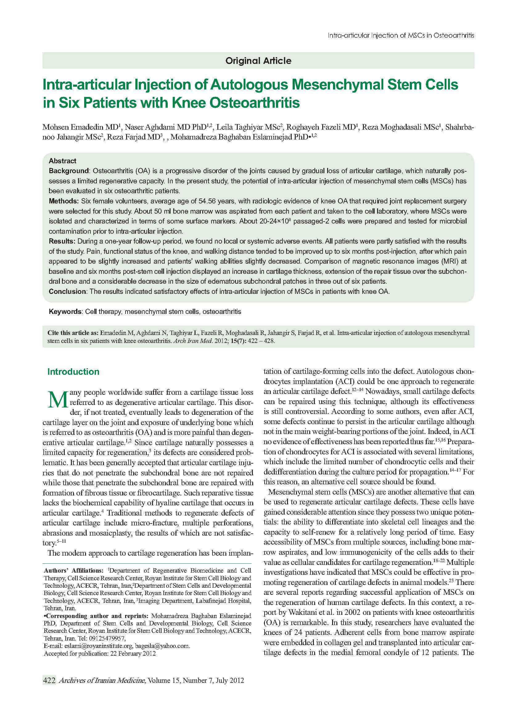自己間葉系幹細胞を変形性膝関節症患者6名へ関節内投与による臨床報告