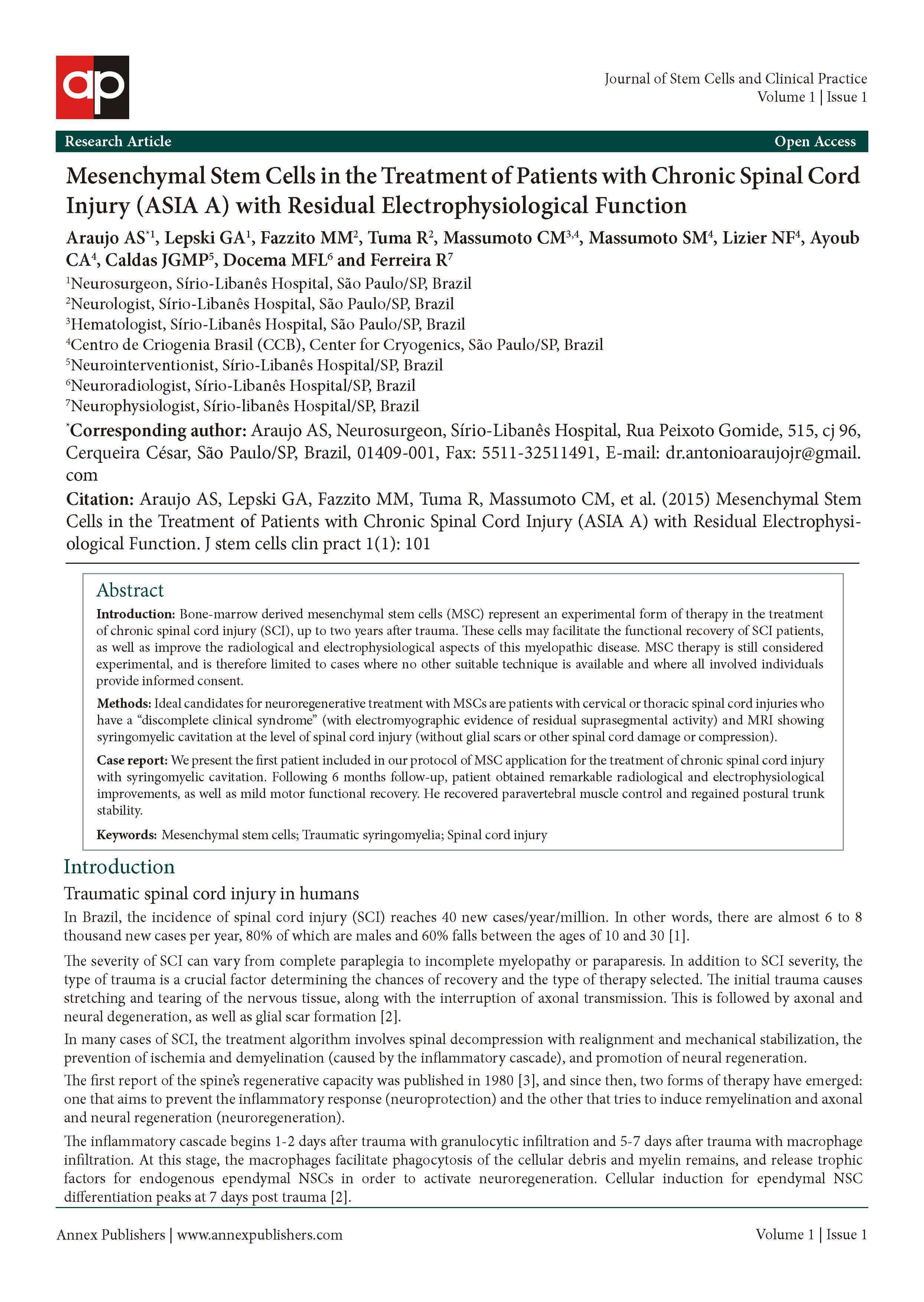 電気生理学的機能が残存する慢性脊髄損傷(ASIA A)患者に対する間葉系幹細胞の投与