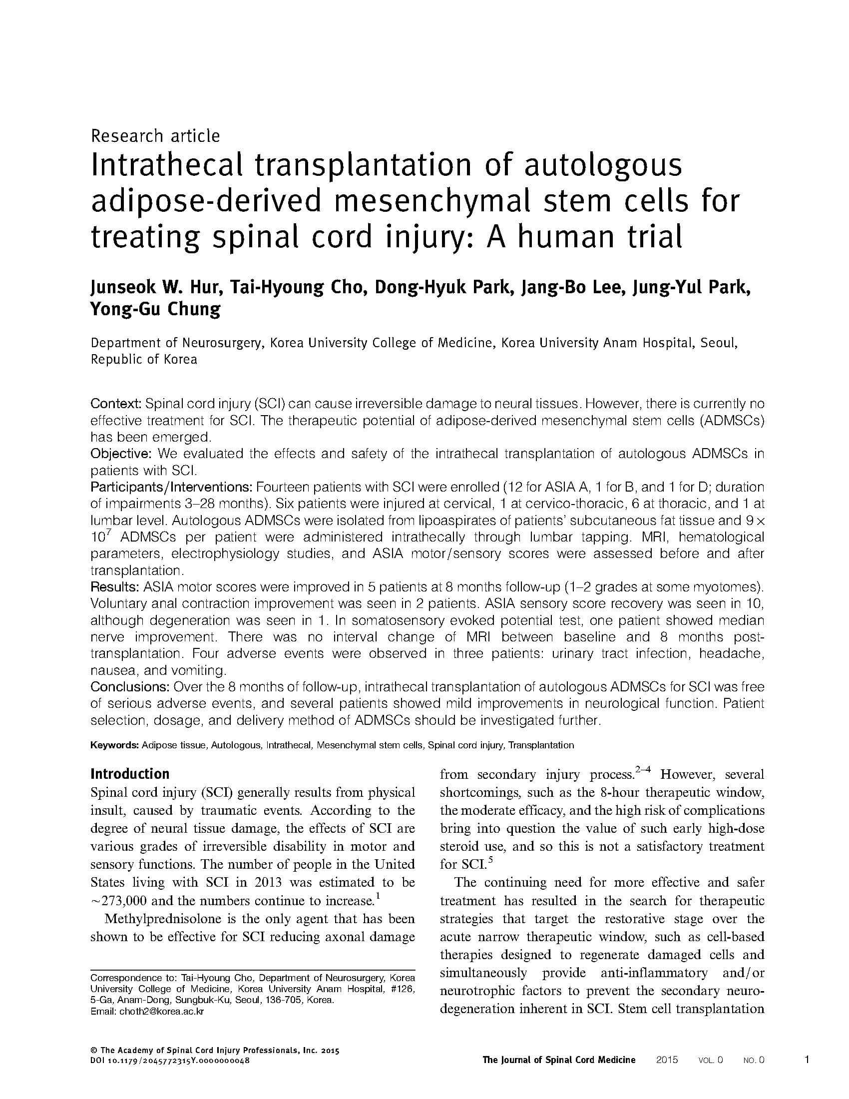 脊髄損傷における自家間葉系幹細胞の臨床的安全性と有効性臨床試験報告